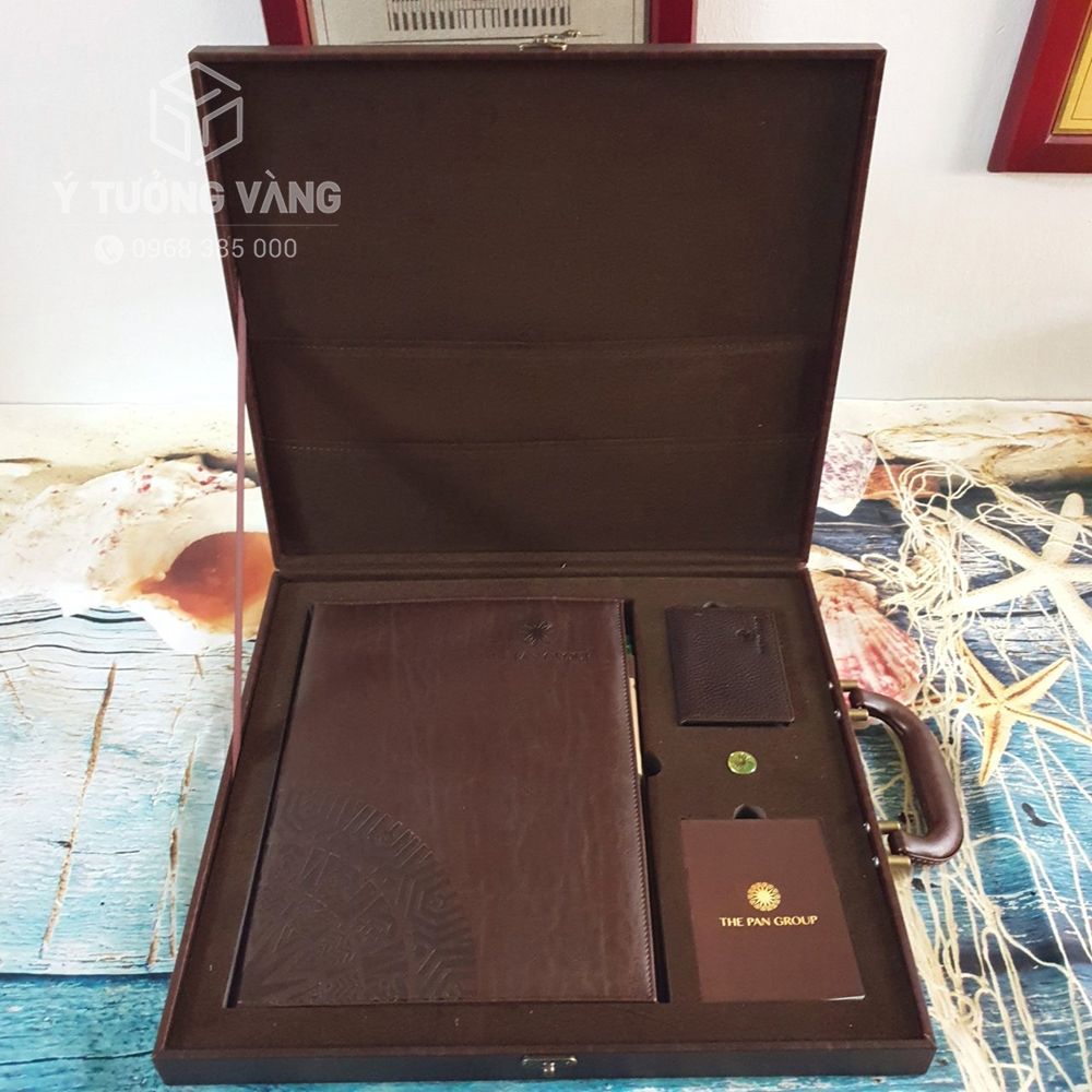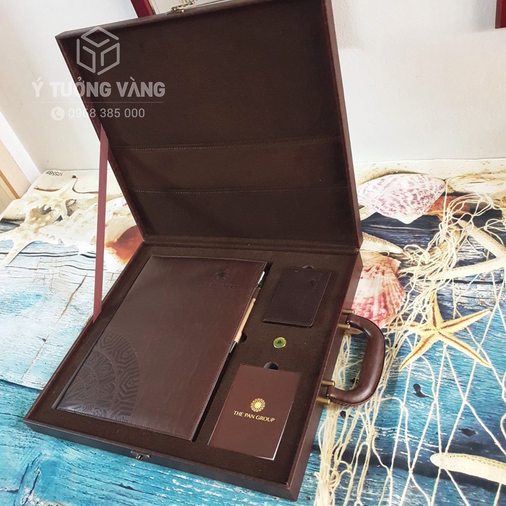 Tiêu chuẩn: Gồm hộp da. sổ da, usb, vì namecard da, bút, huy hiệu