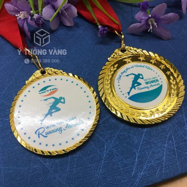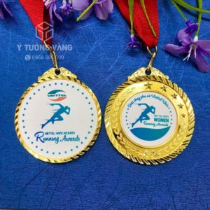 Huy chương mã số 03 là mẫu thiết kế cho Giải chạy phụ nữ Viettel. Sản phẩm có kiểu dáng hình tròn đơn giản mà tinh tế, chất liệu hợp kim mạ màu đẹp mắt. Nội dung ăn mòn đổ màu theo yêu cầu của khách hàng. Một mặt in logo, tên doanh nghiệp và giải thi đấu bằng tiếng Anh. Mặt còn lại in thông tin bằng cả 2 thứ tiếng Anh – Việt với màu sắc tượng trưng thương hiệu. Viền ngoài huy chương dập nổi các hoa văn, họa tiết ấn tượng. Dây đeo màu đỏ nổi bật được làm từ chất liệu vải mềm, đem lại cảm giác thoải mái, dễ chịu cho người đeo.
