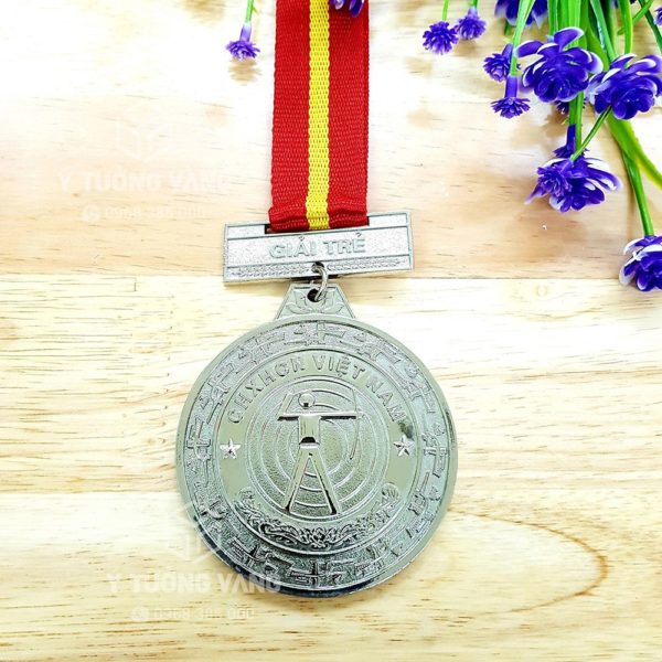 Mẫu huy chương 14 được thiết kế với kiểu dáng mặt tròn đơn giản nhưng tạo ấn tượng bởi những họa tiết nổi bật, sắc nét. Chất liệu hợp kim mang lại độ bền theo thời gian, cùng với đó là lớp mạ bạc sáng bóng, bền màu. Phần trung tâm tấm huy chương khắc họa hình ảnh 1 người bắn cung trên nền họa tiết trống đồng – biểu tượng thiêng liêng ngàn đời của nền văn hóa Việt Nam. Dòng chữ ghi tên đất nước cùng với ngôi sao 5 cánh tạo thành một vòng tròn nổi bật. Viền ngoài trang trí các họa tiết chim lạc đang sải đôi cánh bay cao, thể hiện cho tinh thần Lạc Việt với khát vọng vươn xa hơn nữa. Cùng với đó là dây đeo màu đỏ viền vàng nổi bật, làm từ chất liệu vải mềm, đem lại cảm giác thoải mái, dễ chịu cho người đeo.