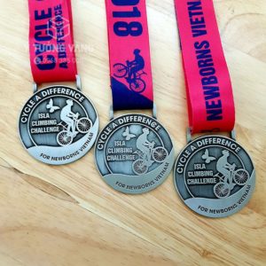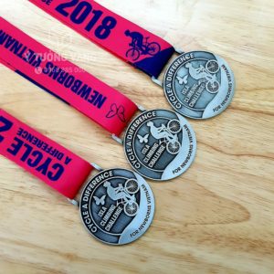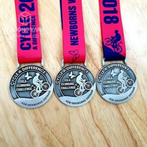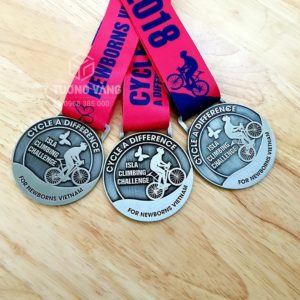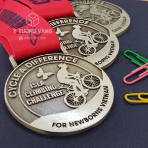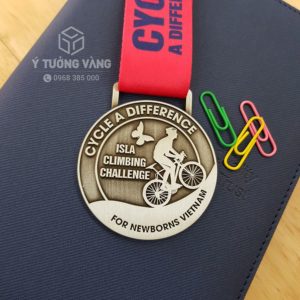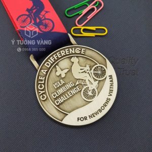 Mẫu huy chương được thiết kế cho giải đua xe đạp leo núi Cycle a Difference được tổ chức bởi Newborns Vietnam. Chất liệu hợp kim đồng đem lại độ bền tuyệt vời, cùng với lớp mạ màu giả cổ độc đáo, sắc nét. Kiểu dáng hình tròn đơn giản nhưng không hề đơn điệu bởi các chi tiết được dập nổi tỉ mỉ, tinh xảo. Bề mặt huy chương minh họa hình ảnh vận động viên đang nỗ lực đạp xe tiến về phía trước với quyết tâm cao nhất. Cùng với đó là hình ảnh cánh bướm tạo nét chấm phá cho cảnh sắc núi rừng trên từng chặng đua. Các thông tin về giải đua, đơn vị tổ chức cũng được trình bày một cách hài hòa, đẹp mắt. Dây đeo đi kèm có in những thông tin chứng nhận hoàn thành cuộc đua.