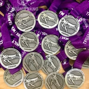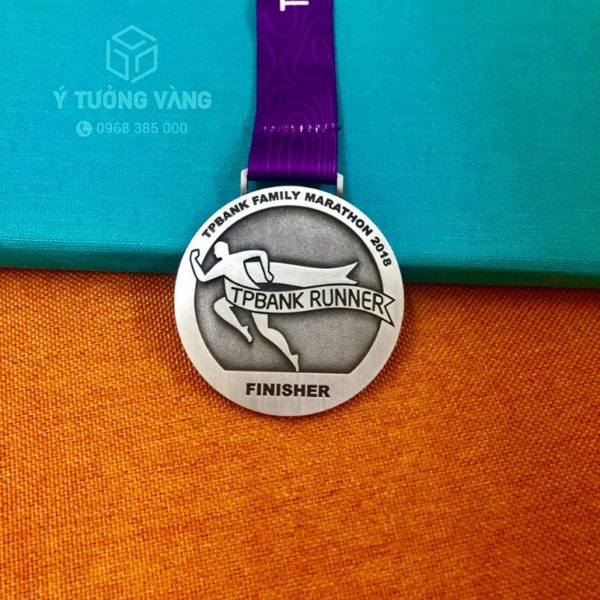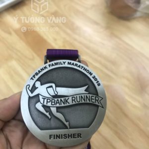 Huy chương TPBank runner được thiết kế cho giải chạy gia đình của ngân hàng TP bank. Sản phẩm có kiểu dáng hình tròn đơn giản nhưng tạo ấn tượng bởi những chi tiết và màu sắc. Chất liệu hợp kim đồng đem lại độ bền hoàn hảo, cùng với lớp mạ màu sắc nét. Bề mặt huy chương dập nổi hình ảnh vận động viên nỗ lực chạy về đích cùng với các thông tin về giải chạy.Dây đeo màu tím được làm từ chất liệu vải mềm đem lại sự dễ chịu và thoải mái cho người đeo. Màu dây đeo cũng chính là gam màu chủ đạo trong logo TP bank.