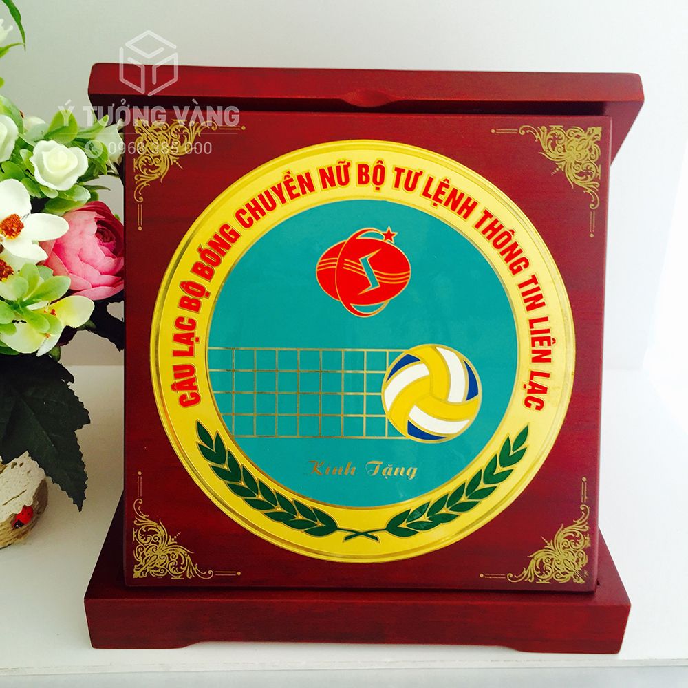 Kỷ niệm chương gỗ đồng 09 được làm từ chất liệu gỗ tự nhiên và hợp kim đồng. Thiết kế với dạng biểu trưng đĩa đồng tròn bố cục trong khung gỗ vuông sang trọng. Viền ngoài đĩa đồng trình bày thông tin cơ quan, đơn vị và có họa tiết bông lúa sinh động. Trong mặt đĩa khắc nổi logo của Bộ tư lệnh Thông tin liên lạc, chính giữa là hình ảnh trái bóng chuyền và tấm lưới – những biểu tượng của bộ môn bóng chuyền. Chữ “Kính tặng” được đề ở bên dưới. Nền phông xanh hài hòa, đẹp mắt. Tất cả tạo nên một tặng phẩm lưu niệm độc đáo, thích hợp trao tặng trong các giải thi đấu thể thao của các cơ quan, ban ngành.
