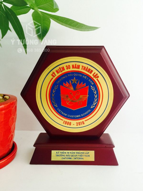 Biểu trưng gỗ đồng 05 là 1 mẫu thiết kế nhân dịp kỷ niệm 30 năm thành lập Trường Hải quan Việt Nam (1986 – 2016). Sản phẩm được làm từ chất liệu gỗ tự nhiên kết hợp với hợp kim đồng mạ vàng cao cấp. Thiết kế theo dạng biểu trưng gỗ đồng mặt tròn, viền lục giác. Trên bề mặt đĩa đồng in đổ màu các hình ảnh, thông điệp, logo của cơ quan, đơn vị theo yêu cầu của khách hàng. Phần đế gỗ được tạo hình theo khối hình thang vuông nằm ngang cân đối, vững chãi và chắc chắn. Trên cạnh khối in khắc nội dung thông điệp để tăng tính thẩm mỹ và tạo nên ý nghĩa cho chiếc kỷ niệm chương.