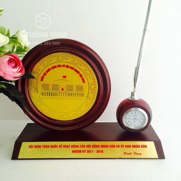 Kỷ niệm chương gỗ đồng 06 là mẫu thiết kế tặng phẩm của Quốc hội – cơ quan quyền lực cao nhất của nhà nước ta. Sản phẩm được chế tác từ chất liệu gỗ tự nhiên kết hợp với hợp kim đồng mạ vàng cao cấp. Thiết kế theo kiểu dáng đĩa đồng bố cục trong khung gỗ tròn rất độc đáo và đẹp mắt. Trên bề mặt đúc nổi họa tiết hoa văn đặc sắc. Đặc biệt, hình ảnh tòa nhà Quốc hội, lá cờ đỏ sao vàng và những cánh chim lạc được điêu khắc 1 cách hài hòa, sắc nét – là những biểu trưng thiêng liêng của dân tộc Việt Nam. Tất cả đều hàm chứa 1 tinh thần Việt sâu sắc. Bên cạnh đó là 1 chiếc đồng hồ xem giờ nhỏ nhắn, sinh động cùng ống cắm bút rất tiện lợi. Phần đế gỗ được tạo hình theo khối chữ nhật nằm ngang vững chãi và chắc chắn. Trên cạnh khối in khắc nội dung thông điệp để tăng tính thẩm mỹ và tạo nên ý nghĩa cho chiếc kỷ niệm chương.